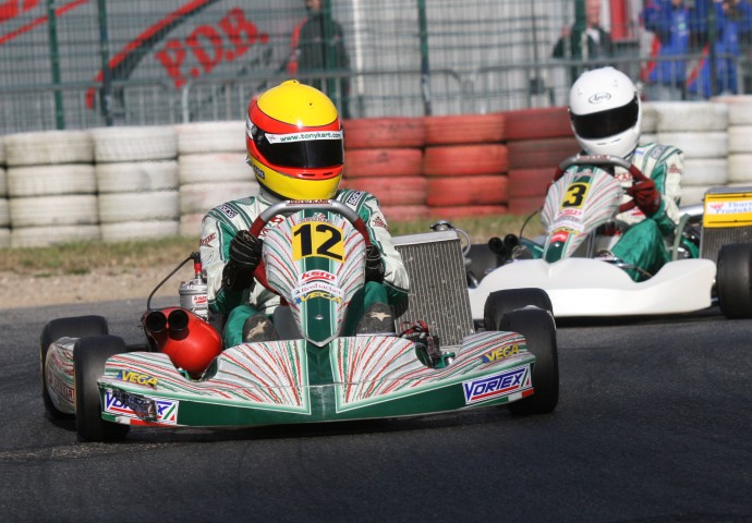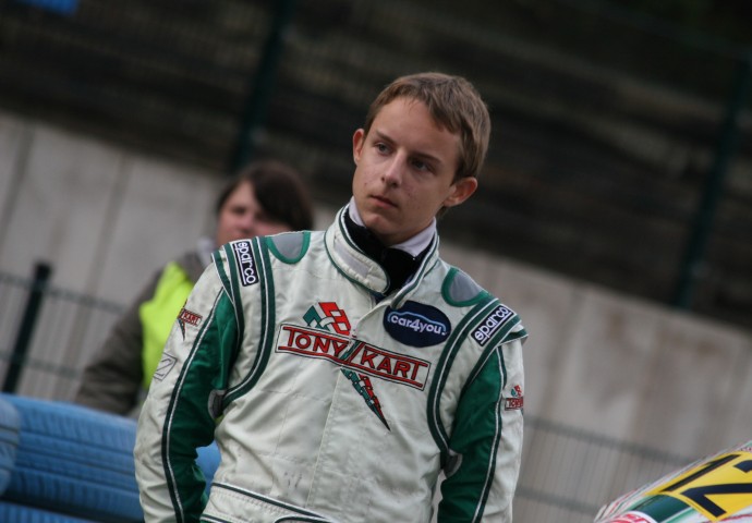 Doch das Glück sollte im ersten Rennen nicht auf seiner Seite sein. Schon am Start ging dem Tonykart-Piloten auf der schlechteren Außenbahn die Strecke aus. Auf der noch feuchten Wiese rutschte er in die Reifenstapel und konnte das Rennen mit havariertem Kart leider nicht mehr fortsetzen.