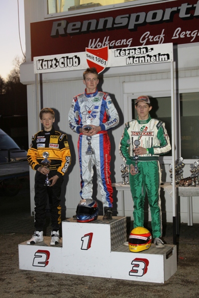 Von "Gewöhnungsphase" war im ersten Lauf dann nicht viel zu sehen, lieferte Detmers doch einen professionellen Job ab. Als wenn er seit Jahren im Seniorkart säße, mischte er ganz vorne im Feld der KF2-Elite mit und wurde im Ziel mit dem hervorragenden dritten Platz belohnt.