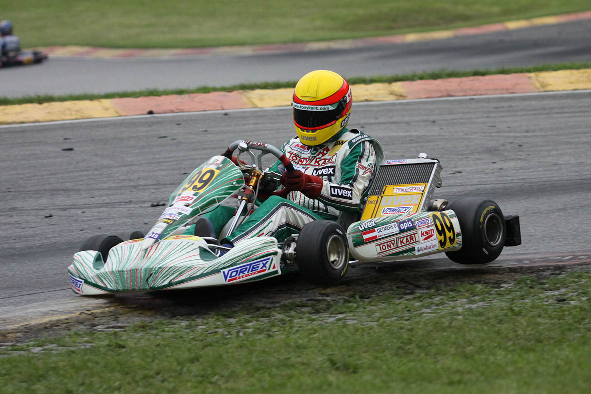 Nach dem Desaster im ersten Rennen, kam es im zweiten Durchgang noch schlimmer. Davids Kart stotterte aus der Startvoraufstellung und er musste noch in der Einführungsrunde aufgeben. „Wir hatten ein technisches Problem mit dem Vergaser. So etwas kann vorkommen. Wir wissen, dass wir schnell sind, müssen das Ergebnis nun nur auch bis in die Finalrennen umsetzen.“