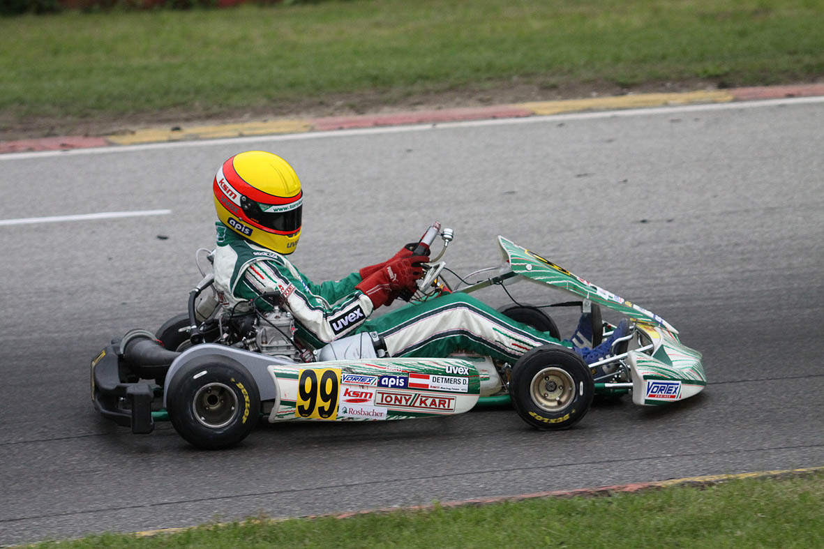 Gestärkt von seiner super Performance beim DMV-Rennen im hessischen Oppenrod nur eine Woche zuvor reiste der Wiener nach Ampfing und war prompt schnell unterwegs. Im Zeittraining platzierte er sein Tony Kart auf der zweiten Position und hatte damit eine vielversprechende Ausgangsposition für die zwei Vorläufe am Nachmittag. Mit einem Sieg und einem zweiten Platz verteidigte Detmers sein gutes Ergebnis aus dem Qualifying und war durchaus zuversichtlich. „Bis jetzt läuft alles gut. Wir haben keine Probleme, das Setup passt und wir können voll attackieren.“